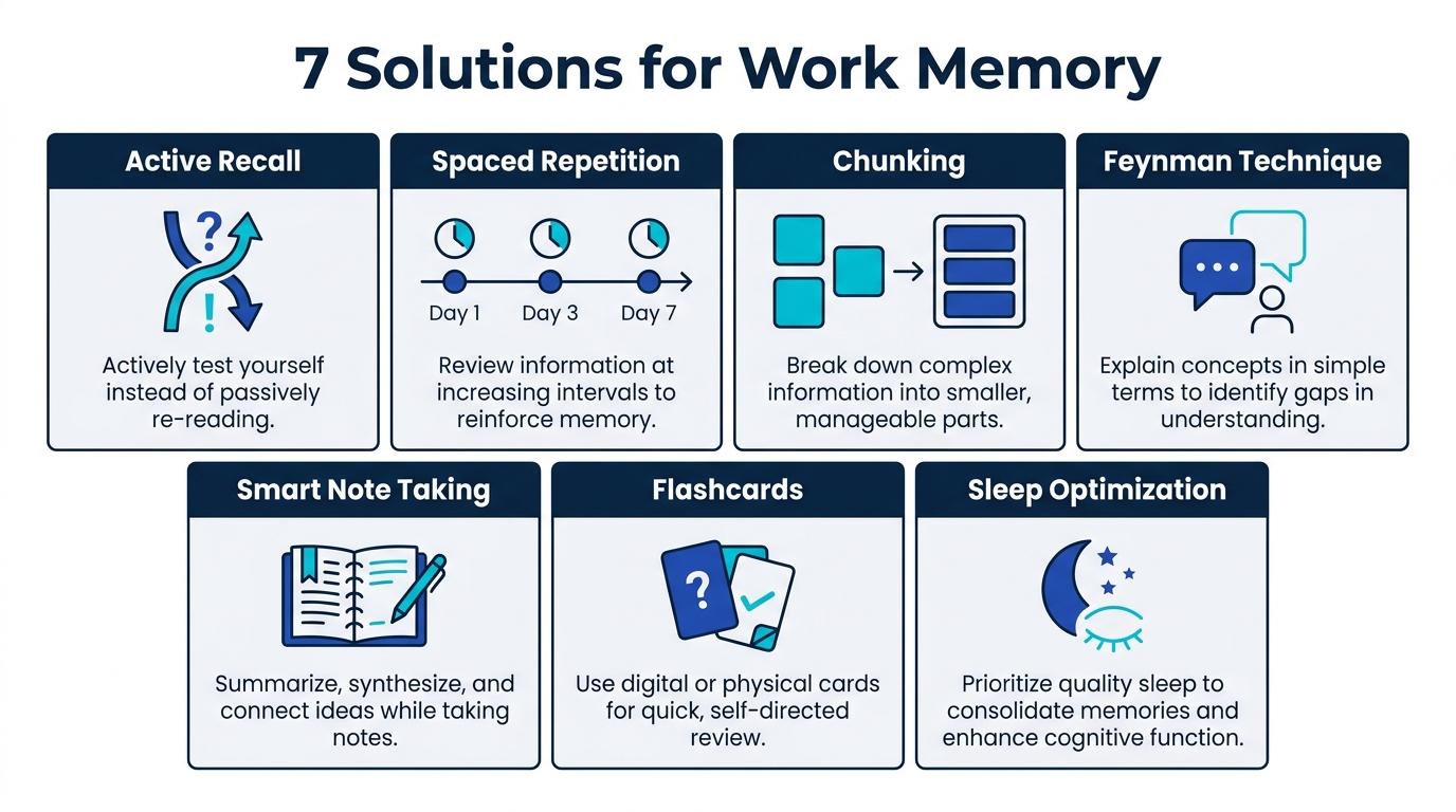 This is the comprehensive guide. The 7 real reasons memory fails at work, the science behind each one, and the specific, evidence-based solutions you can implement starting today. Backed by Dunlosky (2013), Karpicke & Roediger (2008), Cepeda et al. (2008), Walker (2017), Sweller (1988), and Cowan (2001) — the foundational researchers in memory and cognition.