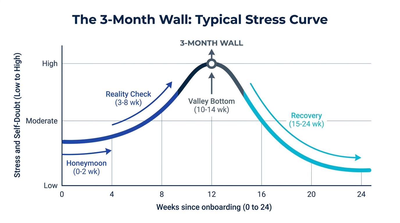 The Wall is the predictable consequence of three forces stacking simultaneously: the honeymoon ending, your manager's patience tightening, and your own self-comparison getting brutal. Notice that almost no one quits at month 6+. The desire to quit is concentrated in months 2–4 and almost always evaporates by month 6 if you stay.