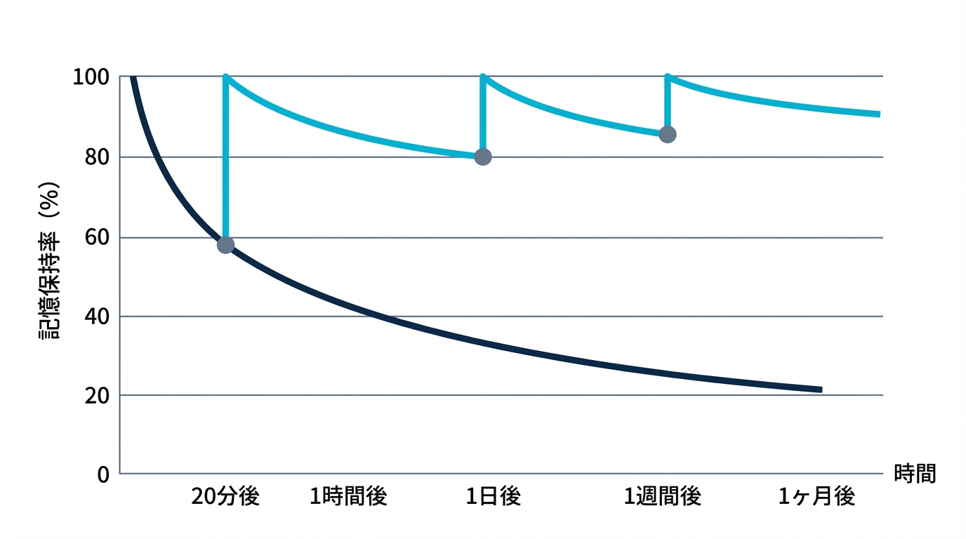 つまり、一度学んだ情報の約80%は1ヶ月後には忘れてしまうのです。従来の「ノートをまとめる」「教科書を繰り返し読む」といった受動的な学習では、この忘却曲線に太刀打ちできません。