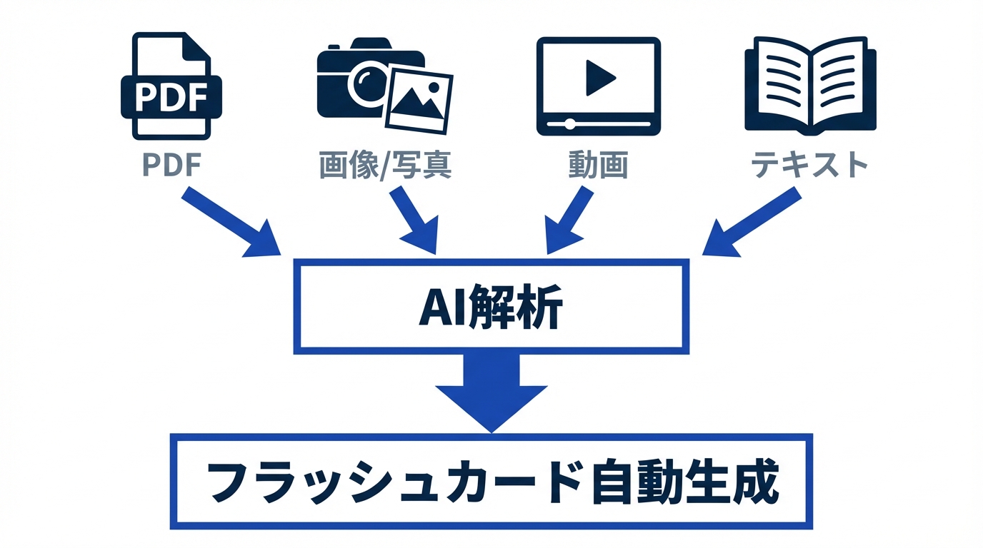 AIフラッシュカードの作成は、PDF・画像・動画・テキストの4つの方法で簡単に行えます。従来のように何時間もかけて手動でカードを作る必要はもうありません。AIが素材を解析し、最適なフラッシュカードを自動生成してくれます。