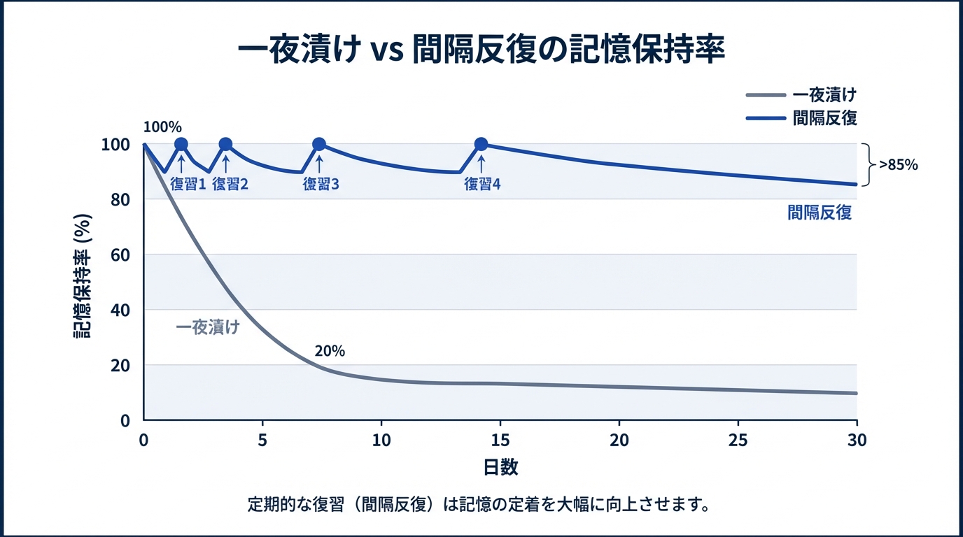 | 直前の詰め込み | 短期記憶のみで試験中に消える | 1週間後に80%忘却 |