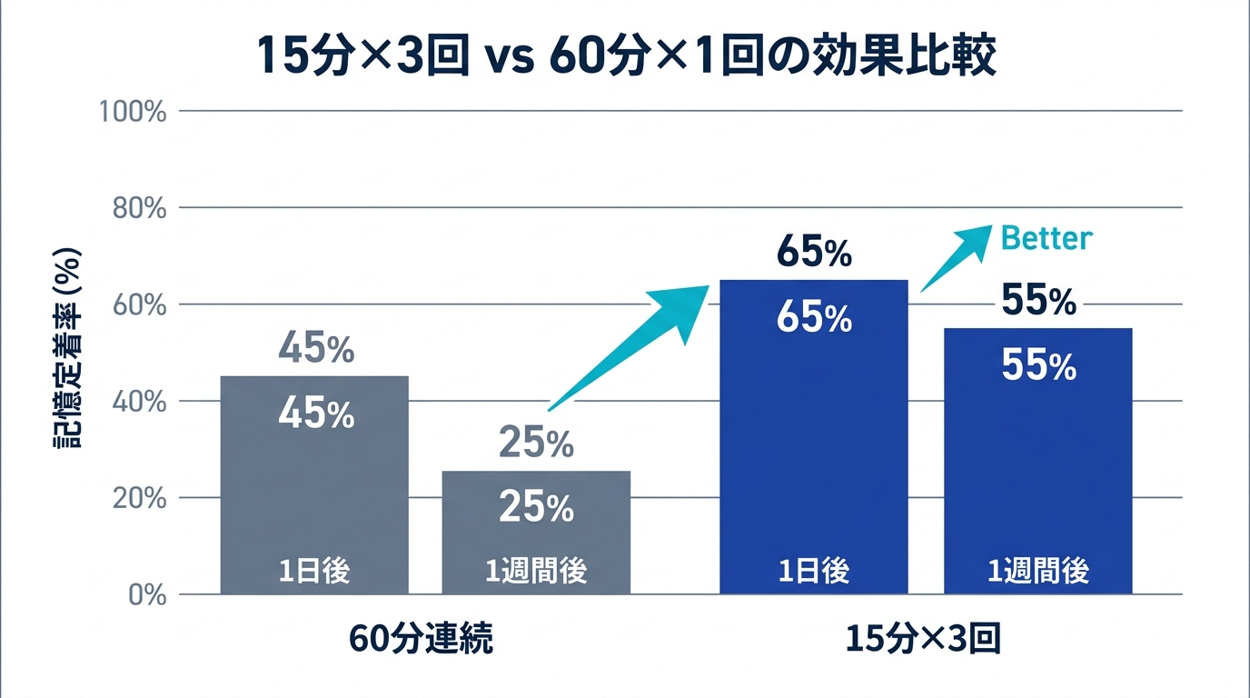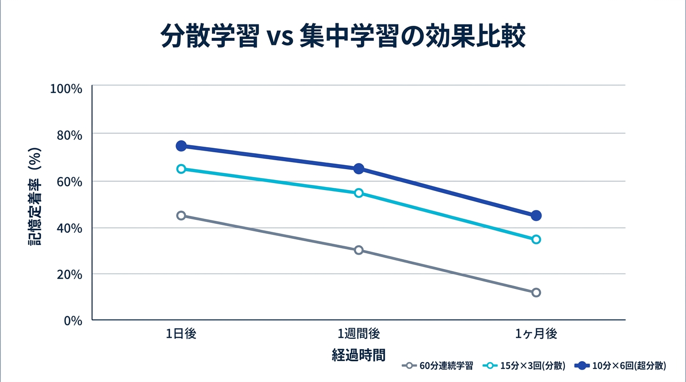 同じ60分でも、分散させると1ヶ月後の定着率が3〜4倍に達する。スキマ時間学習は「やむを得ない妥協」ではなく、科学的に最適な方法なのだ。