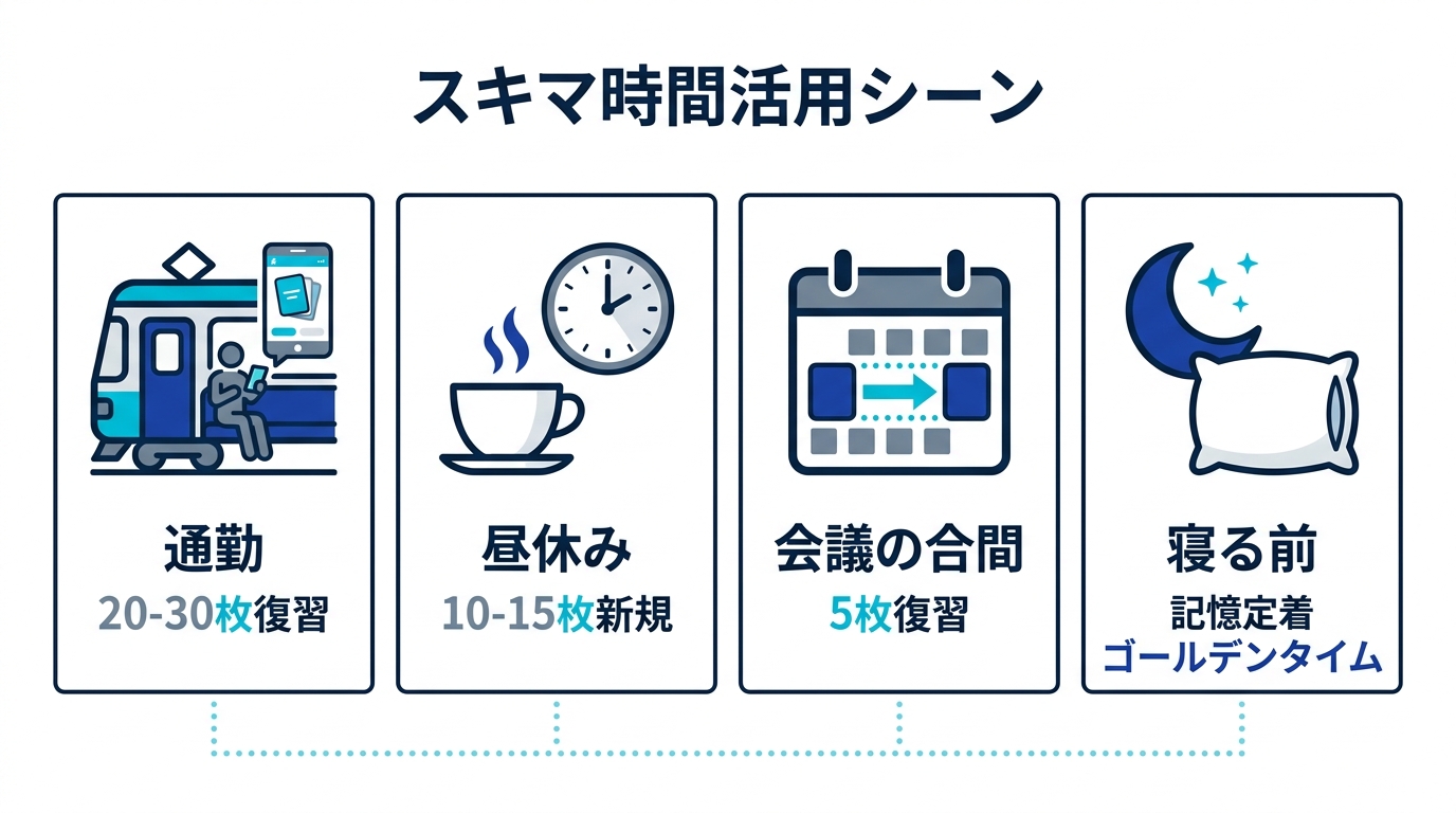 会議と会議の間や、メール返信の合間の5分。フラッシュカードの復習を1〜2回挟むだけで、その日の学習量が大きく変わる。
