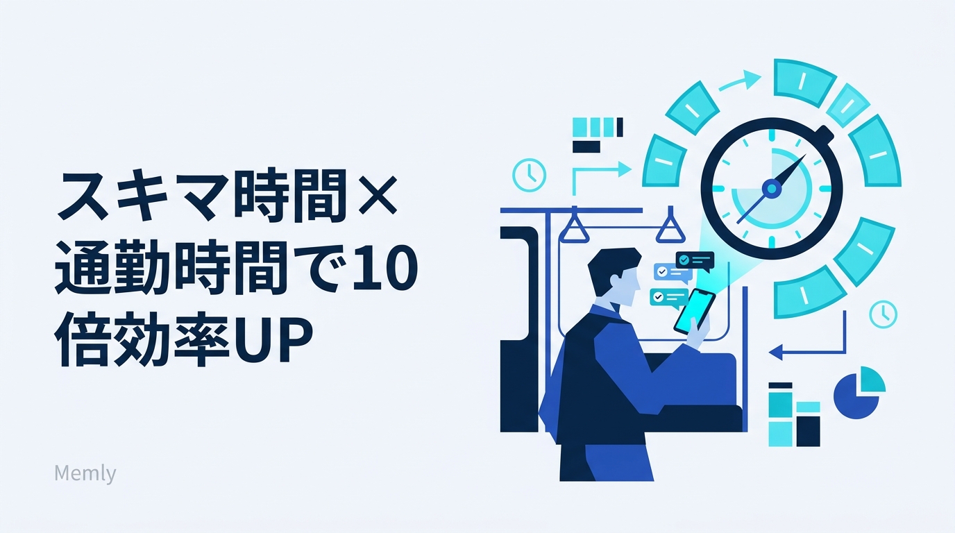 スキマ時間学習に最適なのがMemlyだ。社内マニュアルのPDFをアップロードしておけば、AIが自動でカードを生成。通勤・昼休み・寝る前の5分でも、最適なタイミングで復習通知が届く。詳しくはAIフラッシュカードの作り方を参照してほしい。