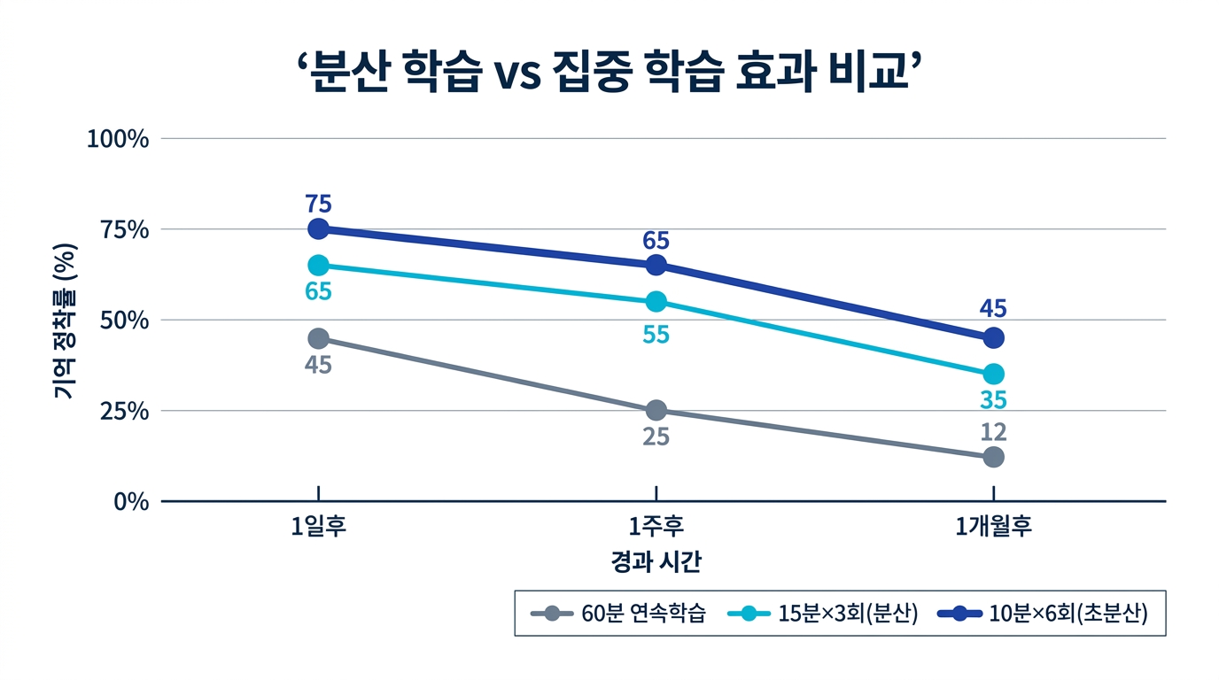 세페다 외(Cepeda et al., 2008)는 14개 연구를 메타분석하여 학습 세션을 분산하는 편이 같은 양을 한 번에 하는 것보다 정착률이 2배 가까이 높음을 보여주었습니다. 자투리 시간 학습은 이 분산 학습 효과를 자연스럽게 실현합니다.