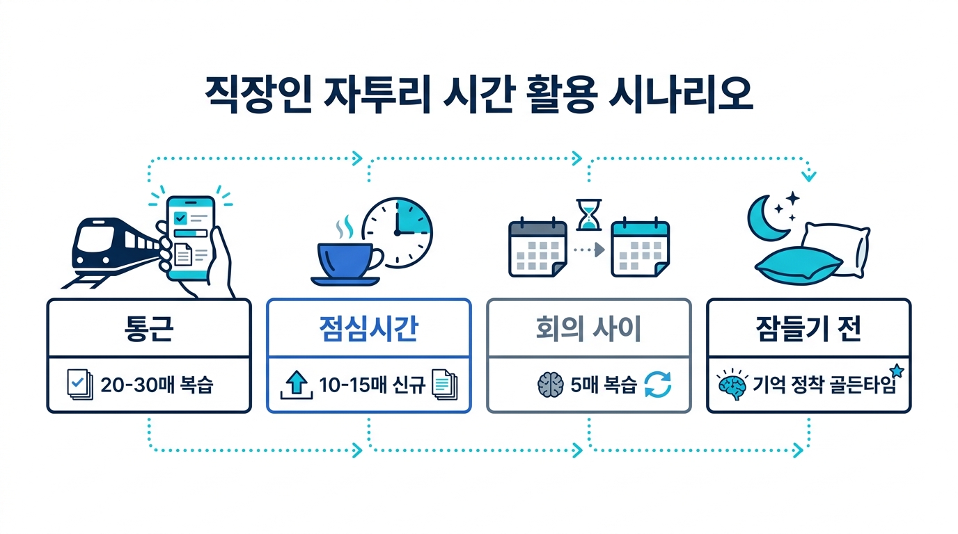 | 아침 통근(전철) | 15분 | 오늘 외울 신규 카드 | 플래시카드 앱 |