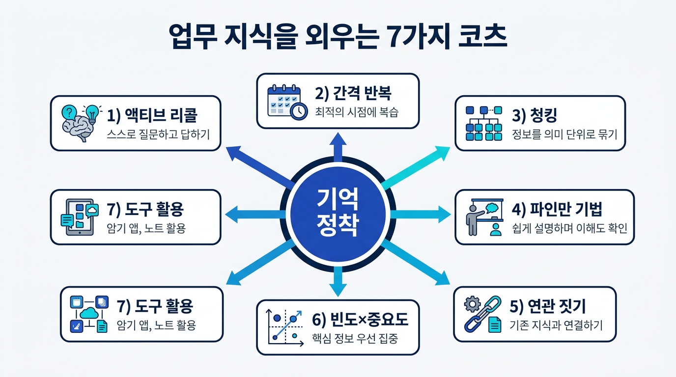 업무 지식이 외워지지 않는 것은 능력의 문제가 아닙니다. 외울 게 너무 많고, 복습 시스템이 없고, 학습법이 수동적이고, 문맥이 보이지 않기 때문입니다. 7가지 비결 ― 빈도×중요도 분류, 능동적 회상, 간격 반복, 청크화, 연관 지음, 메모 되돌아보기, 자투리 시간 활용 ― 을 도입하면 같은 시간으로 3배 정착률을 실현할 수 있습니다.