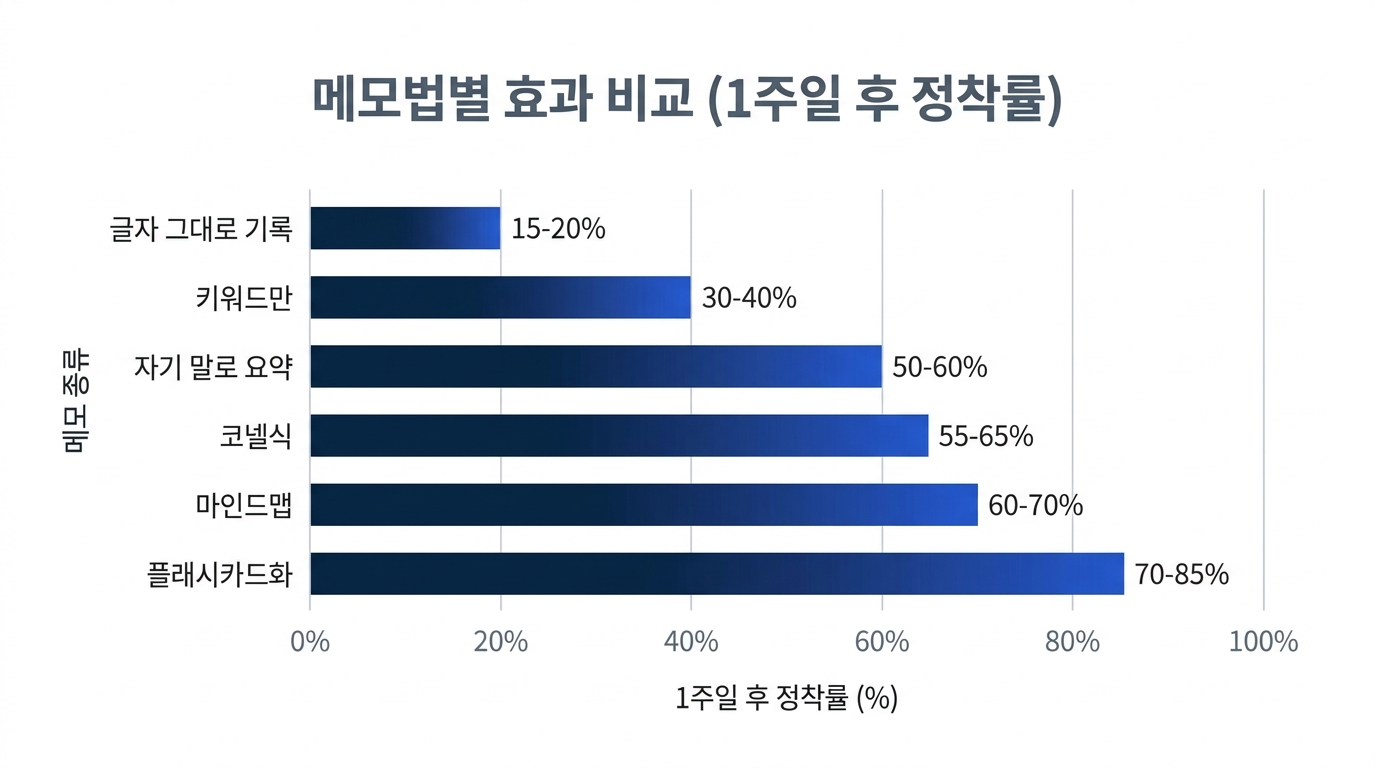 메모는 「쓰는 것」이 아니라 「되돌아보는 것」이 진짜 가치입니다. 하루 끝에 5분만 그날의 메모를 다시 보고 다음 날 머리로 떠올릴 수 있는지 확인하세요. 단순히 쓰기만 하는 메모는 거의 효과가 없습니다.
